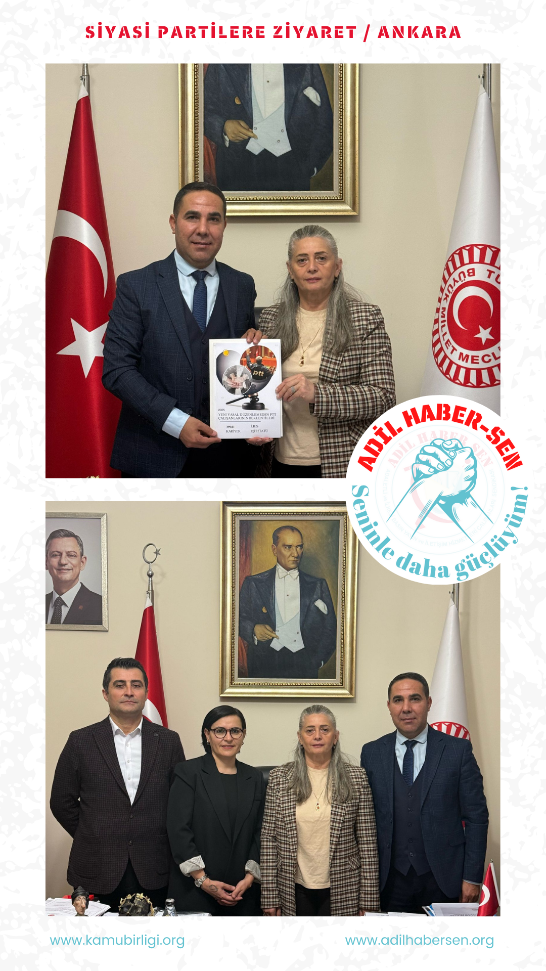 Kamu Birliği Konfederasyonu Genel Başkan Yardımcısı ve Adil Haber-Sen Genel Başkanı Kenan ARIK, Şube Başkanlarımız İsak İsmail YALÇIN ve Dilmen Gülal GÜNER’den oluşan heyetimiz TBMM Başkanlık Divanı Üyesi, Cumhuriyet Halk Partisi Trabzon Milletvekili Av. Sibel SUİÇMEZ’i TBMM’deki makamında ziyaret ederek kamu çalışanlarının talep ve isteklerini kendisine iletmiştir.